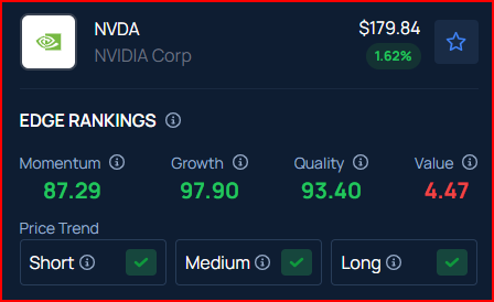 According to Benzinga Edge Stock Rankings, Nvidia has a growth score of 97.90% and a momentum rating of 87.29%. Click here to see how it compares to other leading tech companies.